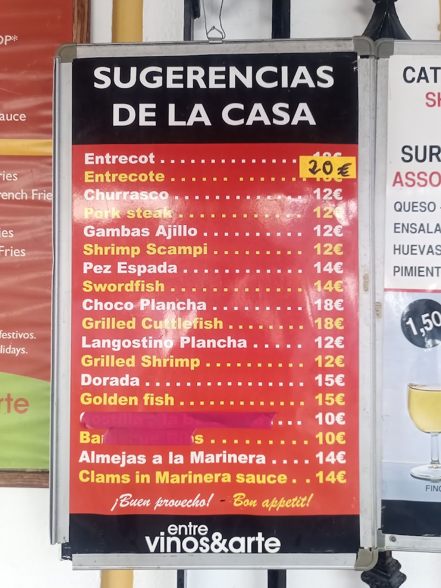 The menu offers a variety of traditional Spanish cafe and bar dishes, focusing primarily on tapas, seafood, and grilled options. It includes well-known regional specialties such as gambas al ajillo, ensaladilla, salmorejo, croquetas, and grilled dorada, alongside other small plates like chocos fritos, boquerones, and various tapas featuring potatoes with alioli. Heartier choices include entrecôte steak and tapa de puntas de solomillo, as well as rice dishes such as paella and manchao.