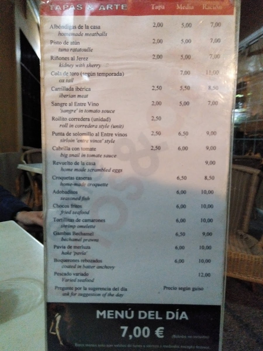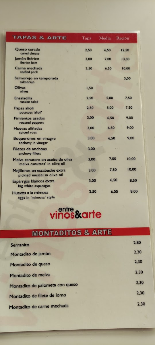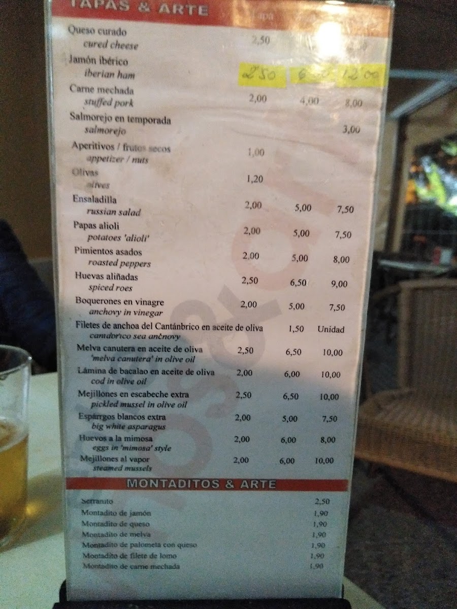 Food selections are typically suited for light meals, casual dining, or sharing as part of a tapa experience. Drinks likely include coffee and sherry, commonly paired with the small plates, suitable for coffee breaks or socializing. The menu layout facilitates quick ordering of individual tapas or more substantial dishes, catering to both brief visits and longer dining occasions.